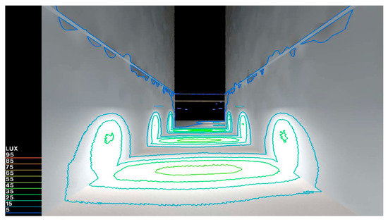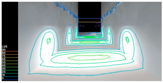 The illuminance simulation with the lighting type L6 showed that the lux levels reached values ranging from 5 to 15 lux, with a small vertical area showing values ranging from 45 to 55 lux. As shown in Figure 33 and Figure 34, there was a weak distribution of light over a small area on the walls, and the lux levels were low compared to corridor B. Case 10 showed similar lux levels as case 9, thus both cases showed poor lux levels, whereas case 8 showed the highest lux levels.