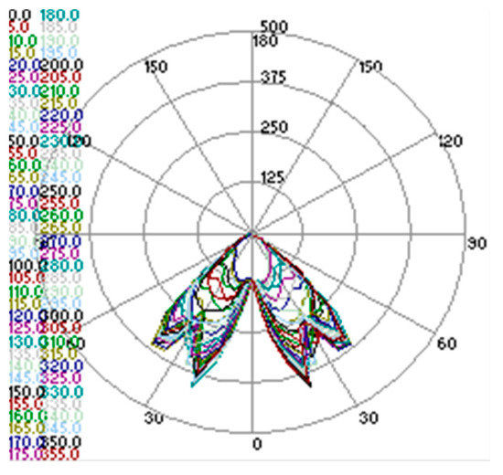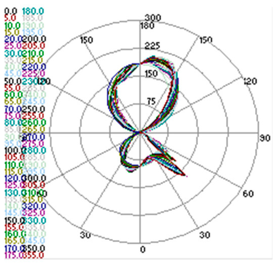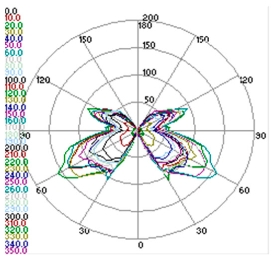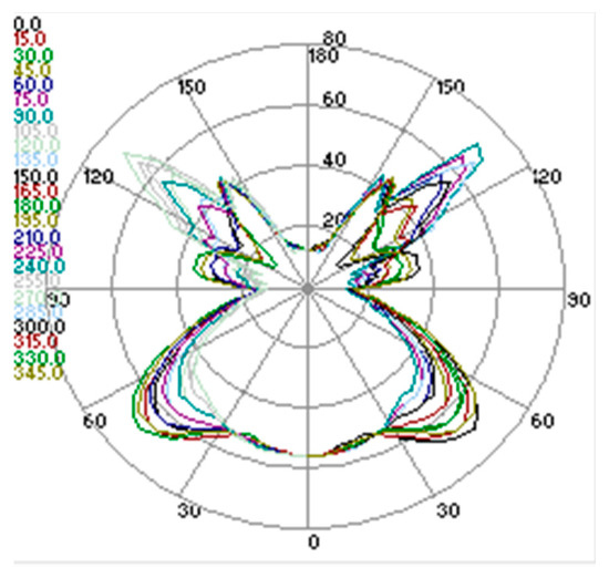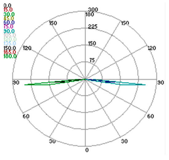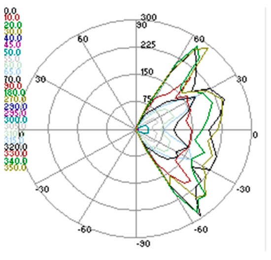 By comparing the results of the four simulations, it was found that the impact of the different parameters on the corridor illuminance differed slightly in lux levels. Therefore, when combining cases 1, 2, and 3, as it was done in case 4, the resulting impact on illuminance was slightly different compared to that measured in each of the single cases, as shown in Figure 15 and Figure 16 for case 4. It was shown that the lighting had a greater impact on the lux levels and lux distribution than the surface materials. For this reason, different IESVE illuminance simulation analyses on different lightings were conducted in order to determine the most convenient lighting type in terms of lux levels and lux distribution (Table 2). Figure 17, Figure 18, Figure 19, Figure 20, Figure 21 and Figure 22 illustrate the photometric polar diagrams of the lighting types L1, L2, L3, L4, L5, and L6, for which IESVE illuminance simulations were performed.