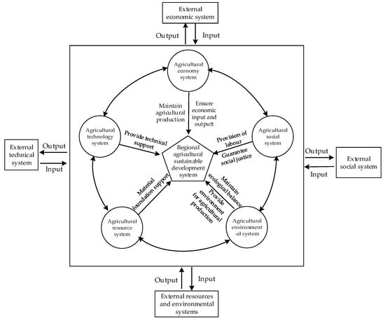 In order to overcome the limitations of previous research, first of all, the objective evaluation method—information entropy method—will be used to weight the measure indexes of regional agriculture sustainable development from objective and scientific perspectives. Secondly, in addition to the exploration of the evolution law of a regional agricultural sustainable development system based on the dissipative structure theory, the coordinated development of the micro structure function of the system is also deeply analyzed in this paper. Dissipative structure theory belongs to the theoretical level of system science [23], revealing the conditions and mechanism of a system from disorder to order; improving system science to the stage of the research system and evolution has been widely used in the evolution of land structure [24], water resource systems [25], urban resource systems [26], the human–earth system [27] and so on. Therefore, in this paper, the theoretical method of dissipative structure and the evaluation mechanism of information entropy are used to quantitatively analyze and measure the sustainable development of regional agriculture.