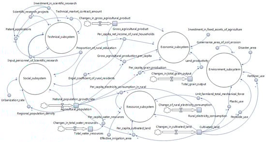 In addition, the system dissipative structure theory shows that the index of each subsystem is not limited to the internal reaction in its system but also plays an important role in every subsystem. There are positive effects (for example, an increase in rural education will increase input of personnel in agricultural scientific research) and negative feedback (for example, an increase in the per capita income of rural households will reduce Engel’s coefficient of rural residents) between indicators, and the coordination and restriction between each other maintain the sustainable development system of agriculture in the whole region in the state of dynamic equilibrium, and the whole system shows the result of the interaction between the indexes, as shown in Figure 3.