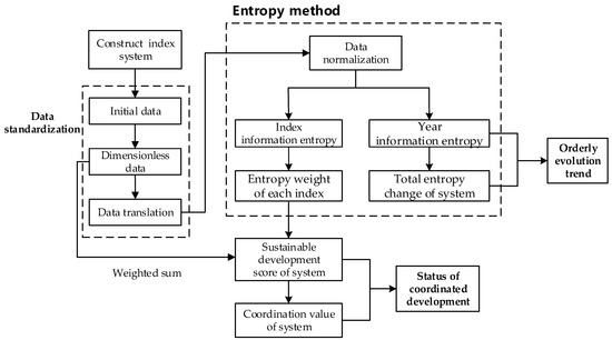 In the dissipative structure theory, entropy is used to describe whether the evolution of the system is orderly. The change of entropy determines the evolution of the system. The total entropy of system (dStotal) is equal to the sum of “entropy generation” (dS1) and “entropy flow” (dS2), that is, dStotal = dS1 + dS2. A complex system can increase the negative entropy flow of the system by constantly exchanging itself with the external factors, so that the total entropy will decrease and the whole system will gradually develop in an orderly direction On the other hand, increasing the internal entropy of the system will increase the total entropy, and the whole system will develop in a chaotic and disorderly direction. Therefore, combined with the theory of dissipative structure, the concept of information entropy can be used to quantitatively analyze the situation of regional agricultural sustainable development system, and the information entropy method can be used to calculate the index information entropy and year information entropy of the system. Among them, the index information entropy is used to determine the weight of each index, and then the sustainable development score and coordination value of the system are calculated to characterize the coordinated development of regional agricultural sustainable development system. Annual entropy information is used to analyze the order and evolution trend of a regional agricultural sustainable development system. The measurement model is shown in Figure 4.
