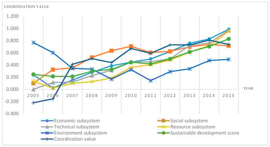 The coordination value of a system is a quantitative index to describe the coordination development status of each subsystem, indicating the degree of harmony between the elements of the system or the system in the development process, which reflects the trend of the system from disorder to order. Suppose that μ is the mean value of the sustainable development score of each subsystem in the i-th year, σ is the standard deviation of the score of the sustainable development of each subsystem. Then, the coordination value of system is calculated.