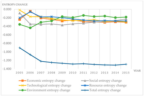 It can be clearly seen from Figure 6 that from 2005 to 2015, the total entropy of the whole system of agricultural sustainable development in Sichuan province declined year by year and began to slow down gradually in 2007. This indicates that the agricultural sustainable development system in Sichuan province has evolved in a healthier and orderly direction, and the whole system tends to be in “dynamic balance”.