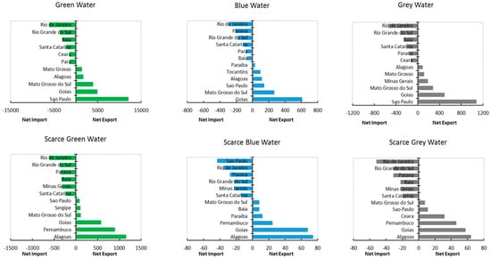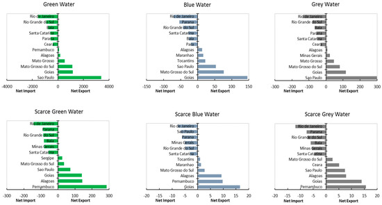 Net virtual exporters and importers of freshwater and scarce water from sugar cane production for ethanol (units in million m3) driven by the final consumption of Brazilian provinces. Negative values on the x-axis show net imports of virtual water and positive values represent net exports of virtual water.