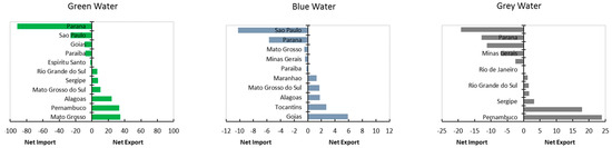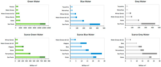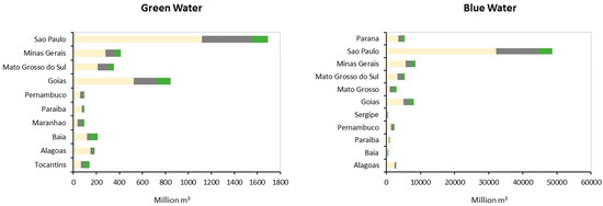 In this way, we were able to capture both rainfed and irrigated agriculture, compared to previous studies in Brazil, which have focused on water consumption associated with irrigation and therefore are limited to the blue water footprint. For the remaining sectors, we focused our analysis on the blue water and grey water footprint, assuming that the green water footprint applies specifically to agricultural sectors.