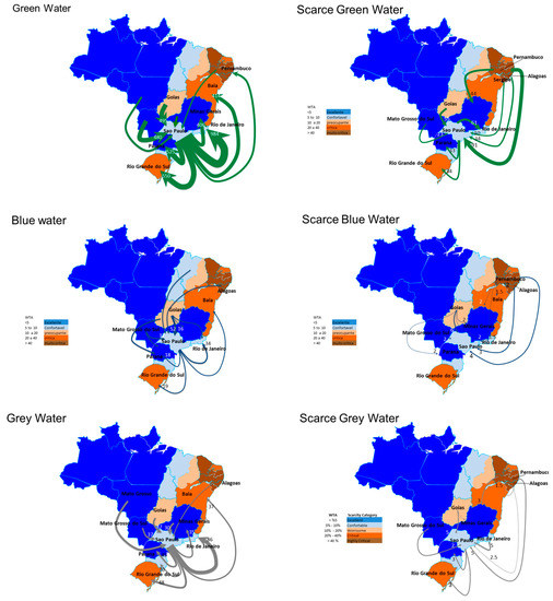We also found that inter-regional flows of virtual water associated with bioethanol production are significantly different when considering water scarcity. Our results show that the three water stressed states Goiás, Pernambuco, and Alagoas led the rank of scarce green, blue, and grey water, which is mainly driven by consumption and production activities in São Paulo and other water abundant states in the southern-center region. Rio Grande do Sul, the only water scarce state in the southern region, with a richer economy, is a net importer of scarce water from Goiás and from other poorer and critically water stressed states in the semiarid northeast such as Alagoas and Pernambuco.