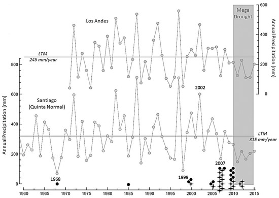 Annual precipitation for Los Andes and Quinta Normal meteorological stations. Stars indicate responses from rural interviewees and circles urban interviewees. Source: Based on precipitation data from DGA-Los Andes and DMC-Quinta Normal, extracted from the CR2 Climatic Explorer ([39], 2016).
