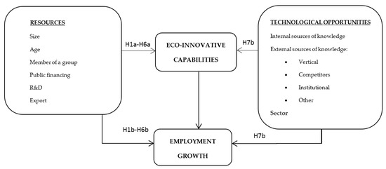 Although environmental innovation is affected by firm pressure and concerns about environment and socio-economic conditions [4,19,62], own resources and capabilities also play a fundamental role in explaining the firm’s innovative performance. The development of eco-innovation usually implies investing in technologies that change the firm’s capability in terms of knowledge creation. To meet these challenges, the firm’s resource base is modified. Hence, this change affects firm performance, namely, employment dynamics. From this perspective, the conceptual framework used for analyzing the drivers of eco-innovations and employment is based on the resource-based view theory (RBV) (Figure 1). In this regard, the RBV paradigm serves to “examine the link between a firm’s internal characteristics and performance” [63]. To do this, the RBV (resources) and competitive dynamics (actions) are integrated. In this way, identifying the linkages between resources and the decision to eco-innovate will contribute to understanding why some firms experience better performance in terms of employment [64]. Thus, this approach makes it possible to analyze the influence of internal and external factors in the decision to eco-innovate and employment growth (performance), taking into account the eco-innovative strategy (action). Based on the arguments above, the proposed theoretical framework is as follows:
