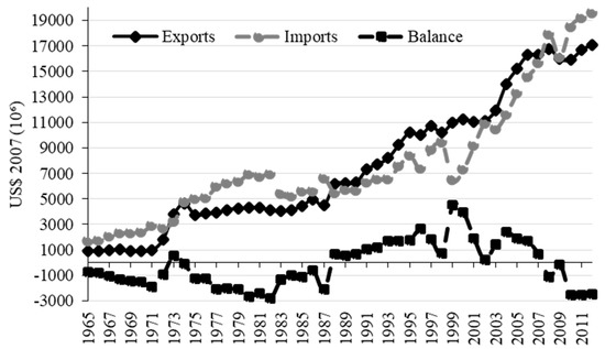 Ecuador trade balance, 106 2007 US$, 1965–2012; Source: Central Bank of Ecuador [52,53].
