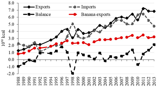 Ecuador exports, imports and balance of food products (1012 kcal), 1988–2013.