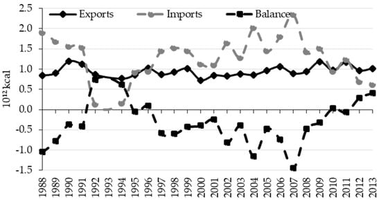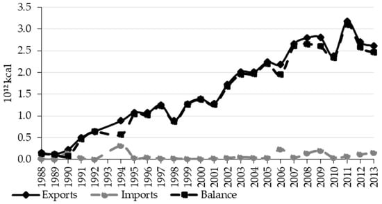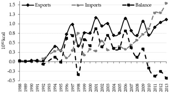Evolution of exports (X) and imports (M) measured in kcal by product group, 1988–2013.