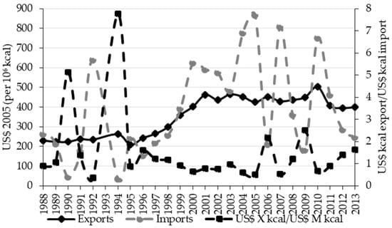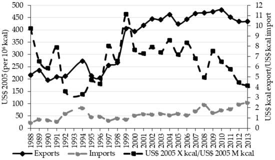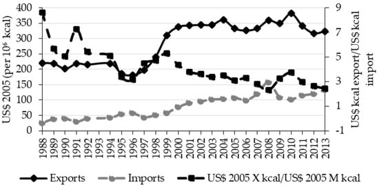 In order to respond to the two objectives of the paper, we use the recently introduced concept of caloric unequal exchange, defined as the deterioration in the terms of trade of food traded when considering the cost of exported and imported calories [3], and explained with detail in Section 2. The study originally introducing the concept focused on Latin America and the Caribbean as a block, showing that, even if calories exported were more expensive than those imported, there was a deterioration of the terms of trade since 1961 and the region was increasingly feeding the rest of the world at ever cheaper costs to the calorie. This went along with an increased volume (and value) of exports, making explicit the recent turn, to intensify the international insertion of the region as a provider of commodities to the rest of the world. This international insertion is seen by some as positive from an economic point of view. However, the impacts upon the environment in terms of soil deterioration, export of nutrients, and increased energy consumption and CO2 emissions from those exports, are still not clear as there are only a few studies that analyze the loss of nutrients involved in food exports [4].