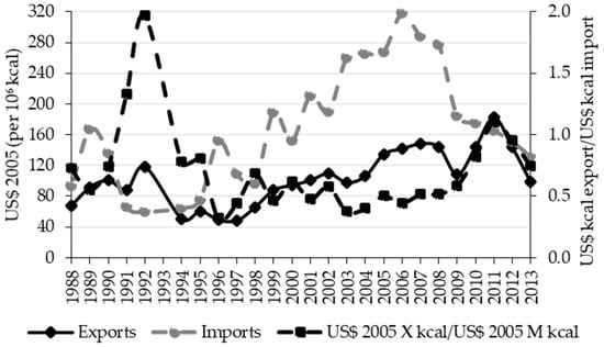 Using the coefficients described above, we converted trade data (exports and imports) in volume into calories. In order to analyze the Prebish-Singer hypothesis [5,7] of the deterioration of the terms of trade in terms of calories, the average calorie content per 100 grams reported in the food composition tables was used as proxy for expressing exports and imports in terms of calories, for product i in the year t.