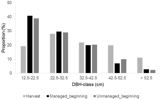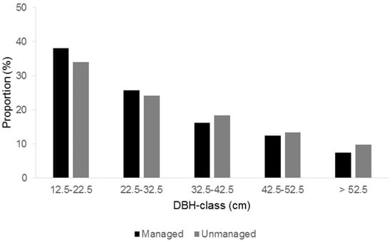 DBH-class distributions of overstory trees for the managed and unmanaged stands.