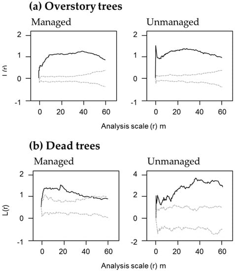 Spatial distribution of (a) overstory trees and (b) dead trees in the managed and unmanaged blocks. The Ripley’s L values as a function of the analysis scale (r) are shown with thick (black) lines. The area enclosed by the two thin (gray) lines indicates the 95% confidence interval derived from the simulation, assuming random distribution.