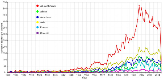 The number of natural disasters between 1900 and 2017 (Source: International Disaster Database).