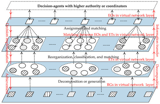 Following Figure 2, it can be concluded that a set of the scattered EOs with different capabilities are identified and virtualized, which results in the corresponding virtual network layer. On the other hand, after the occurrence of natural disasters, rescue goals (RGs) in physical layer are identified, and then mapped into virtual network layer by decision-agents as soon as possible. In practice, RGs will be decomposed into different ETs, thus identifying a series of ETs. In other words, all ETs are generated based on the RGs [32]. Then, these ETs are reorganized and classified, thus constituting ETs in virtual network layer. Thus, coordinators or decision-agents with higher authority would determine the matching relations between EOs and ETs in virtual network layer. In other words, EOs with different capabilities would be assigned to accomplish these ETs in an optimized way.
