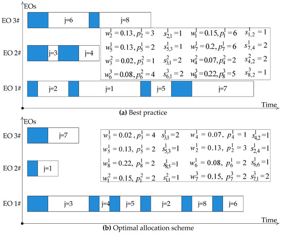 A deterministic case is considered in this subsection. A fixed value of each parameter can be given by computers. The combinations of these fixed values are regarded as a deterministic instance with 8 ETs and 3 EOs. In this context, one of the feasible assignment schemes regarding EOs from practical decision-agents is defined as the best practice for SDSC. It is depicted in Figure 4a, thus acting as a suitable benchmark. The method doing like this is also considered by Wex et al. [12]. They opined that rescue units assignment scheme obtained from the German Federal Agency of Technical Relief (THW) were treated as the best practice behavior of emergency operation centers. On the other hand, this paper uses branch and bound approach to improve the best practice, thus gaining optimal allocation scheme of EOs presented in Figure 4b.