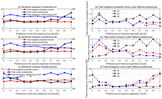 Sensitivity analysis of decision-agents’ preferences to three objective functions. (a) Sensitivity analysis of preference β1; (b) Sensitivity analysis of preference β2; (c) Sensitivity analysis of preference β3; (d) Change of total weighted completion times under different preferences; (e) Change of total carbon emissions under different preferences; (f) Change of total emergency costs under different preferences.