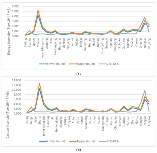Carbon emissions in 2020 are calculated by taking the energy consumption quota after optimizing, and multiplying the corresponding carbon emission coefficients, which were provided by the Intergovernmental Panel on Climate Change (IPCC 2006) [27]. Carbon emissions in 2015 are calculated by the primary energy consumption multiplied by the corresponding carbon emission coefficients. The energy data used were acquired from the energy balance sheets, published in the Energy Statistical Yearbook. Considering the prediction error, the ZSG-DEA results with the administrative targets within an interval are compared, which take 90% and 110% of the administrative targets as upper and lower bounds, respectively.