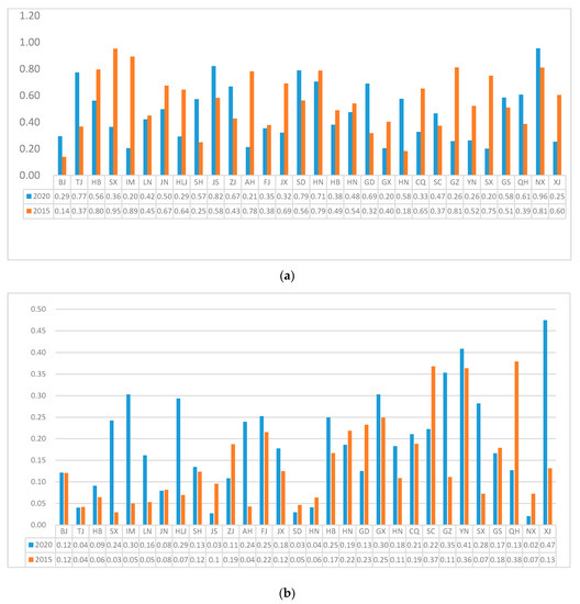 (a) The proportion of coal in energy consumption of each province in 2015 and 2020 (after ZSG-DEA adjustment). (b) The proportion of non-fossil fuels in energy consumption of each province in 2015 and 2020 (after ZSG-DEA adjustment). Due to space limitation, the names of provinces are abbreviated by their initial letters.