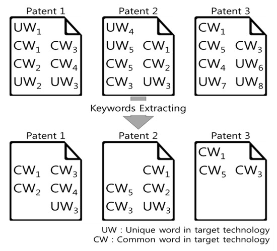 A patent is objective and proven technological information, which contains one or more unique technical features that cannot be duplicated in other patents. Patents have been used as essential information for effective management strategies [1,2]. Structured data such as the issue date and the number of citations, as well as unstructured data such as summaries and claims included in the patent, can be useful in analyzing competitive markets and technology trends [3]. In many studies on structured data, the features or trends of technology development have been obtained by using patent search and international patent classification (IPC) [4,5,6]. Currently, considerable research is underway that includes unstructured data rather than only structured data to produce more meaningful results. In order to analyze a large number of patents, it is necessary to analyze the contents of unstructured information such as titles, summaries, and claims [7]. In the most commonly used keyword-oriented analysis, not all keywords are extracted, but keywords are analyzed according to specific criteria [4] and the linkage between technological fields [8].