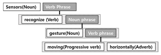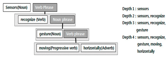 Figure 3 shows the result of tagging information of phrases and the parts of speech in the sentence, “sensors recognize gesture moving horizontally” through NLP. Assuming that ‘sensors’ is one of the constituent elements of the patent, it can be seen that the most important information is the ‘sensors’, which provide additional information on horizontal movement, which is a feature of the sensors and gestures. The information in the Depth 1 can be defined as ‘sensors’ and the keywords in the Depth 2 become ‘sensors’ and ‘recognize’. Thus, the keywords of Depth n + 1 can be defined as a set of keywords appearing at a level of the nth and keywords appearing at a level of n + 1th. Therefore, the extraction rule that extracts layered keywords using the depth concept is defined in the sentence classified by types of technological information.