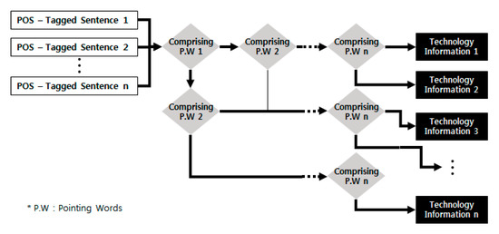 We use pointing words defined on the basis of descriptive type of technological information. The sentences in the title, summary, and claims are structured according to technology types based on whether or not pointing words appear. As described in Section 3.2.1, the type of technological information is not classified by only one pointing word, but by multiple pointing words and the texts included in the titles, abstracts, and claims are structured according to the types of technological information in a sentence, as shown in Figure 4. For example, if a sentence has a noun that refers to a patent, and a verb that means inclusion, it includes the elements that the patent itself contains. On the other hand, when a sentence has a noun that refers to the patent as well as a verb that is related to inclusion, it can be seen that one of the components of the patent contains elements other than the patent itself. In a sentence, a noun that is not the name of a patent can be considered as a component of the patent.