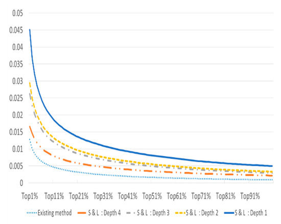 We compared the average TF-IDF of the keyword set using the existing keyword extraction method and the structuring and layering (S & L) proposed in this study while changing the ratio of the keywords extracted from each keyword set. Figure 6 shows that as the number of keywords increases, the average value of TF-IDF decreases. In addition, it can be confirmed that the S & L method has a higher average value of TF-IDF than the conventional method. In this case, as the depth decreases, the average TF-IDF value increases. Therefore, it can be said that the keyword with low depth has information that is unique to each patent. On the other hand, as the depth increases, the TF-IDF value becomes lower. Therefore, as a keyword that has higher depth is extracted, each keyword appears in various patents rather than in one patent.