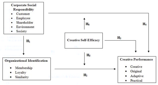 Organizational identification should be directly related to employee engagement. This model suggests that individuals who strongly identify with their organization are intrinsically motivated to support the success and viability of their organization, because of the integration of the organization and their self-concept [60]. Individuals who strongly identify with the organization are inherently interested in the organization’s welfare, and therefore, this model suggests they are more willing to display extra role behaviors to promote the organization’s welfare [107]. Organizational identification will partially mediate the relationship between CSR and employee creative performance [108]. Self-perception of high creative efficiency among employees directs them to involve in better creative outcomes [102].