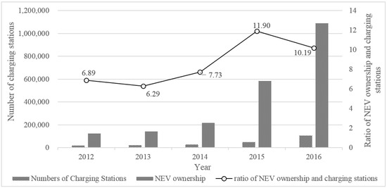 According to the China Association of Automobile Manufacturers’ data, in 2012, China’s new energy vehicle production was 12,552 in total, and the new energy vehicle public charge pile was 18,000 in total. However, from the development of new energy vehicles and charging piles from 2012 to 2016, the production number and sales number of China’s new energy vehicles have increased much faster than the speed of charging pile construction. On the one hand, it reflects the lagging construction of the piles; on the other hand, it also indicates the development of new energy vehicles has caused the potential demand for piles, particularly with the difficulty in achieving a breakthrough in battery technology. The allocation of the changing pile is a key problem. In accordance with the standard of one car one pile, the demand and supply gap concerning piles is huge, as shown in Figure 2.