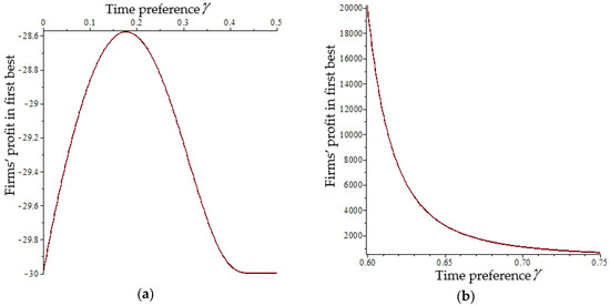 Consider the two cases of we have discussed in Section 3.3; we find that, when , firms’ profit in first best is negative; thus, there is insufficient entry in the long-term equilibrium, as is shown in Figure 3a. While firms’ profit in first best is positive, there is excessive entry in the long-term equilibrium when , as is shown in Figure 3b. This result shows that the EV consumer time preference γ has a threshold, which describes the EV consumer’s time inconsistency that the consumer values highly today’s consumption when is larger. Due to shortsighted behavior, firms will excessively enter the EV market when consumers pay more attention on today’s consumption.
