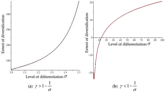 In the case when , which means is larger, the extent of diversification is small, and the consumer does not care so much about consumption today, as is shown in Figure 4b. Then, it is possible for some small σ when the benefit of diversification is relatively large for the benefit of entry to be large enough to overcome the fixed cost of entry. Thus, it is better to encourage more firms to participate in the EV market. In other words, firms tend to enter insufficiently in a free market since they did not take the benefit of diversification into consideration and were hindered by the entry barrier, fixed cost . While for some larger , the benefit of entry is small, and there is no need for enhancing competition, so the entry in equilibrium would probably be excessive.