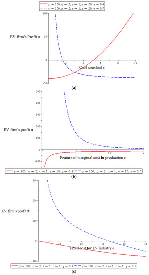 (a) Sensitivity analysis of the constant cost parameter; (b) sensitivity analysis of the feature of marginal cost in production; and (c) sensitivity analysis of fixed cost for EV industry.