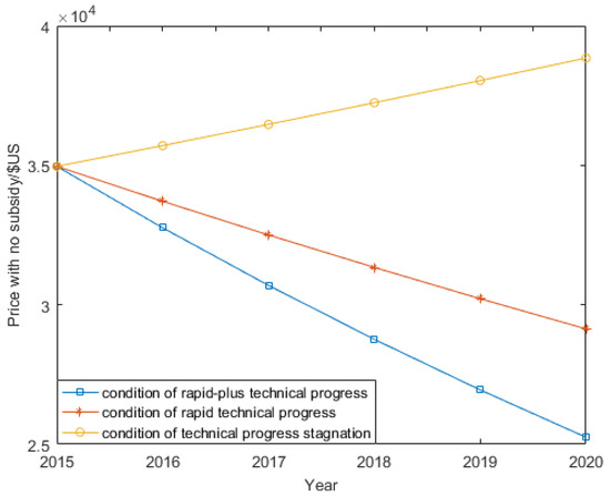 According to our survey, we find that the costs of EVs are largely due to their power batteries, so engineers are continually concentrating on the technology to improve the battery capacity and service life to lower the unit cost. Based on Zhang et al. [29], the unit cost of battery in 2015 is $380/kWh, and we assume three different kinds of situations: stagnation, rapid growth and rapid growth plus, in which the unit cost of battery decrease at the rate of 4.5%, 9.8% and 12.3%. Together with the paper of Hao et al. [31], we reasonably speculate the battery capacity will increase at the rate of 6.8% per year, in the next five years. Thus, we can compute the battery cost. In addition, through our market survey, we find averagely, the cost of batteries makes up half or 60% of that of EVs, leading to a simple way to obtain the estimated price of EVs, as shown in Figure 6.