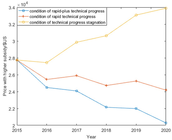 Next, consider an important factor in the sales of EVs: subsidy by the government. In fact, the subsidy is very different in diverse regions. According to the data we have collected and the research of Zhang et al. [29], we find some provinces used to provide subsidies of half the EV’s price, while others no more than $1500. To conduct the new plan of the central government, many local governments have to lower their subsidies on the consumption of EVs. We distinguish three types of situations based on the different subsidies: a higher one means the subsidy is more than $6800 per car, which is common in eastern provinces. A medium one offers $4500 to $6000 as the subsidy for each EV, which is known in some western provinces. A less common situation is the lower one, providing a certain amount less than $3000 per car. Thus, we make the estimation as follows to obtain the real payment of purchasing an EV for consumers. Estimation result with highest subsidy is shown in Figure 7, while the other two are hided because of similar trends.