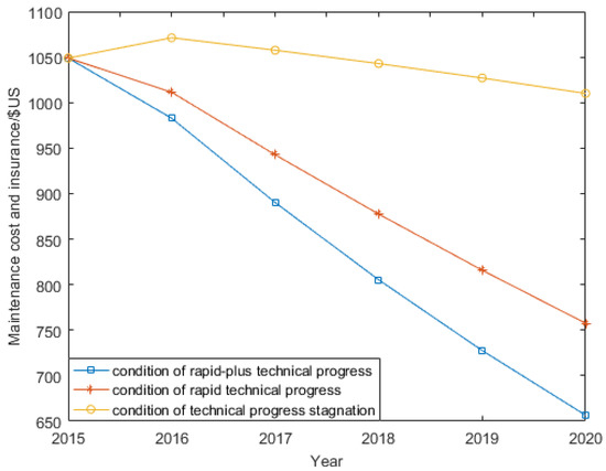 From the following graphs, we find the importance of technology advances for EV consumers, which is a determinant for EV’s price. Rapid growth of technology lowers the cost of battery, and increases the service life of battery, to make the EV more efficient and more convenient, which influences the market demand of EV’s. While comparing the situations within and without subsidy, we can hardly find many differences on the trend of EV’s price, which tells the weaker effect of subsidy on the preference of consumers, to some degree. On the other hand, it is easy to find that rapid growth of technology will decrease the loss of utility resulting from a decline in the level of subsidy. In other words, it could be an efficient way to provide subsidies for EV producers to stimulate their technological advances rather than for the sales to consumers indirectly. Moreover, we have to admit, under the situation of a low level of subsidy (even a medium level of subsidy), the real payment of EV is not that competitive compared with traditional cars based on equivalent conditions. To adapt to the upcoming new subsidy plan, EV producers have to try hard to increase their returns to scale and decrease their marginal cost, by innovating the producing technology. Furthermore, we find another important effect of rapid growth of technology is to lower maintenance costs and insurance. Estimated maintenance costs are displayed in Figure 8. According to our interviews with consumers and insurance salesman, we discover the expensive insurance somewhat is an obstacle for potential EV consumers, which is much higher than traditional cars. Reason for this problem is the high uncertainty of EVs’ batteries, which is liable to damage. Therefore, rapid growth of technology is beneficial for consumers to decrease their insurance, to stimulate their demand.