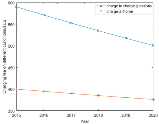 Next, we have analyzed the ordinary expense of an EV to obtain the advantage of EVs compared with traditional cars. Generally, owners of EVs have to charge at public charging stations for one or two hours during their operational period. Some reasons for this situation are the heavy investment and the low efficiency of charging piles. According to Zhang et al. [29], we assume a typical owner of an EV, with 14,143 km driving per year.
