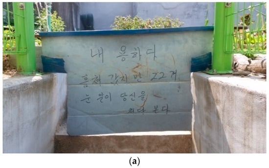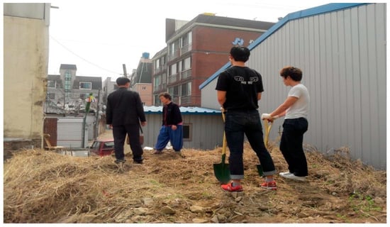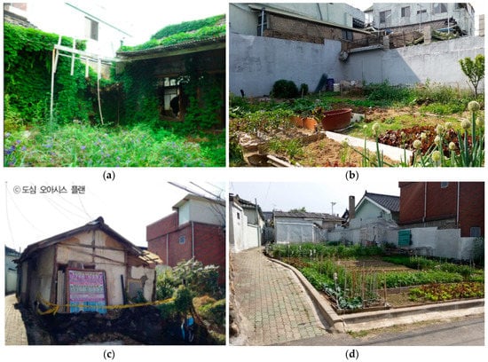 - Ha, C.; Kwak, H.; Kim, H. A study on utilization and making vegetable garden of vacant land and deserted house in deteriorated low-rise residential area for neighborhood regeneration—Focused on no-song low-rise residence district in Jeonju. J. Urban Des. Inst. Korea Urban Des. 2013, 14, 81–93. [Google Scholar]