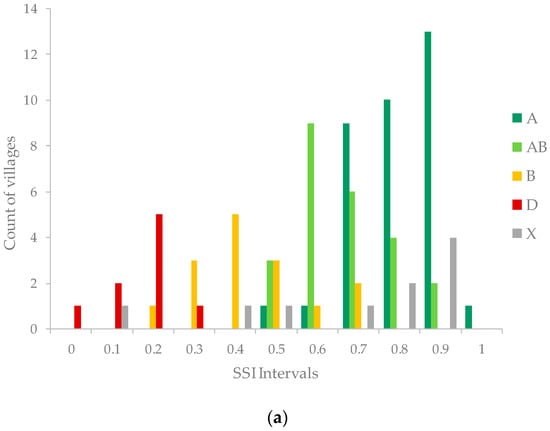 As mentioned before, the SSI values of the two transects are not directly comparable due to their different shapes. If both transects were treated as a single population, and SSI was recalculated on that basis, some villages of the S-transect are classified to a neighbouring stratum (Table A3), but the overall pattern of frequency distributions as presented above remained the same.