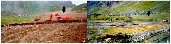 Ski run construction above the treeline in the Italian Alps (Courtesy of Monterosa Ski Resort). (A) The arrow indicates the ski run surface after the removal of rocks, levelling and the replacement of the topsoil; (B) The arrow indicates ski run surface 2 years after seeding.