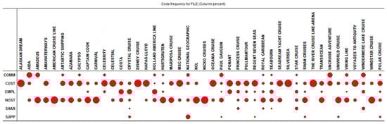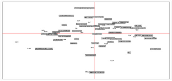 Codes (i.e., topics) with similar distribution among mission statements are plotted near to each other. Moreover, the more similar the profile of coding characterizing the mission statements, the nearer they are. In particular, a similar coding profile emerges for Holland America Line, Crystal Cruise and Seabourn, probably related to their belonging to the same premium/luxury segment. In the same direction, it is possible to identify a similar profile in Amawaterways, Transocean and Captain Cook.