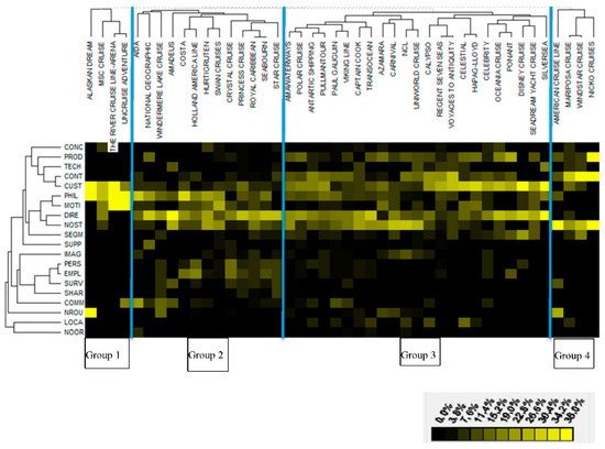 The heat-map suggests that cruise lines provide different information in their mission statements and, on the basis of their content, in particular the similar distribution of the different topics, it is possible to identify four groups of cruise operators.
