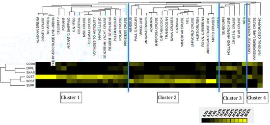 The heat-map is a graphical representation of data where the individual values contained in a matrix are represented as colors. The graphic representation visualizes the relative frequency of topics assuming diverse color and brightness, thus facilitating the identification of functional relations between rows (i.e., topic frequency) and columns (i.e., cruise lines’ mission statements). In particular, the brighter the color, the higher the frequency of the topic.
