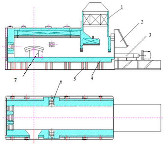 Structure of a continuous furnace. 1—preheater; 2—charging furnace door; 3—pusher; 4—furnace body; 5—furnace bracket; 6—burner; 7—discharging furnace door.