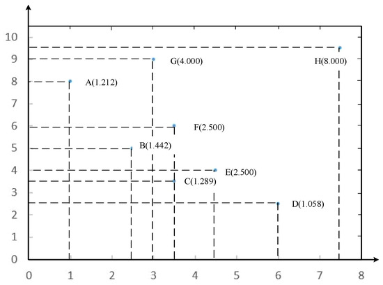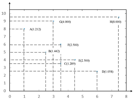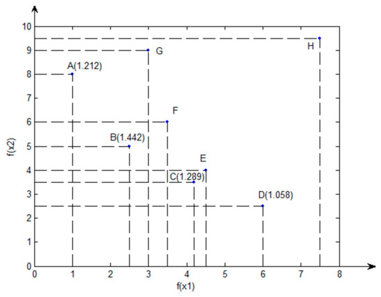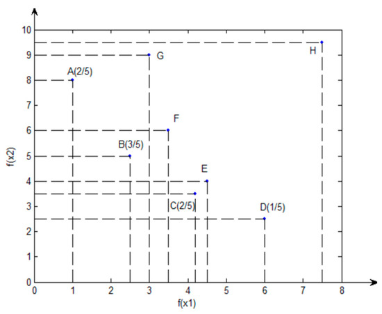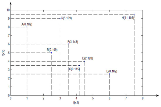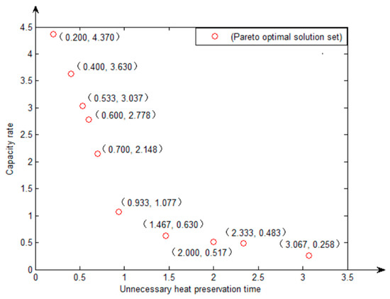 The 10 Pareto solutions whose heating hours are long are screened out by Equation (17) and, finally, the shortest solutions are selected. The final solutions in this case are points (0.533, 3.037), (0.933, 2.000), and (0.400, 3.630), the total heating time of these points are T = 27.