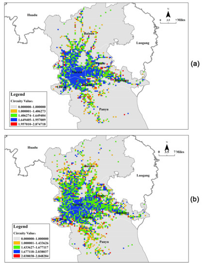 Subsequently, the spatial distribution of travel circuity for the three districts withinthe transition area is compared in Figure 7. Urban travel focuses on the region that is close to the core area of the district affected by the taxi FCD. It was found that the high travel circuity regions were also concentrated in the area close to the core area. The regions which were far away from the core area presented lower circuity. However, Baiyun district was the opposite, where it was closer to the core area it displayed, with lower travel circuity, indicating that the convergence of Baiyun district and the core area was closer.