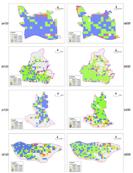 To better comprehend the spatial distribution of travel circuity, research areas were shown in Arcgis10.2. Spatial overlay analysis was used to acquire the O point and D point of each grid that was 100 × 100 m. Consequently, this paper estimated the average value of travel circuity of point O and point D which belonged to each grid. Using the first scale, one can find out that the range of distribution of O points distribution was less than D points for the whole urban travel in Figure 3. The O points of trips were distributed in the core area mainly, while D points of trips were not only distributed in the core area, but also in the transition region. It should be noticed that the distribution range of D points in the transition region was higher than O points.