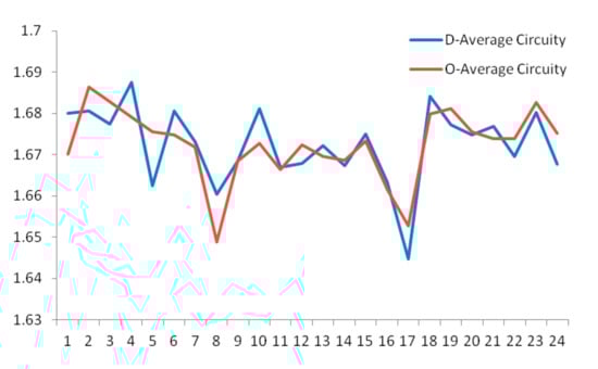 Depending on the observation on the change of average travel circuity in 24 h, it was found that the value of travel circuity increased rapidly from 7:00 a.m. to 10:00 a.m. and 6:00 p.m. to 7:00 p.m. The average travel circuity values of O points rose faster in the morning, from 1.64 to 1.66 in two hours. The average travel circuity values of D points were alternately larger in the afternoon, which is increased from 1.64 to1.68 in two hours. Figure 8 presents the temporal distribution of travel circuity in 24 h.