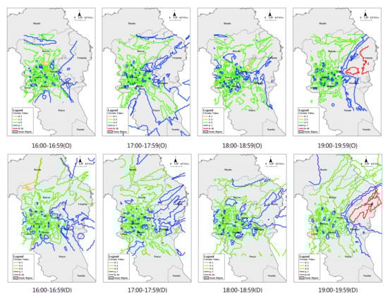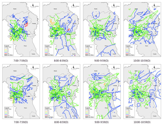 Defining the is oline of travel circuity in various period was found that travel circuity of O and D points converged on the transfer area in the morning and evening peak hours, when a ribbon gallery distribution appeared. During the time from 7:00 a.m. to 9:00 a.m., travel circuity transfer from Baiyun, Panyu and Luogang to Yuexiu, Haizhu and Tianhe, and spread from the fringe area to core area. The range from 9:00 a.m. to 10:00 a.m. showed the travel circuity of the core and fringe area was greater than the transition area. During other periods, the distribution of travel circuity was more balanced. Beginning at 5:00 p.m. to 7:00 p.m., travel circuity was appropriate to provide the delivery from the core area to the fringe area. Finishing at the end of evening peak hours, it demonstrated a large area of travel circuity in Luogang, a fringe area. Figure 9 shows the distribution of travel circuity in different periods.